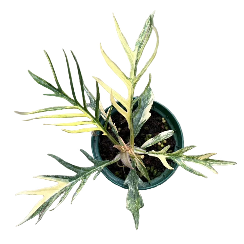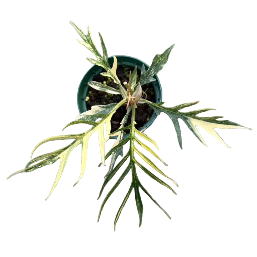 Philodendron tortum aurea variegated is a rare collector’s plant featuring finely divided, skeletal leaves splashed with golden-yellow variegation. Its narrow, finger-like lobes create an airy, architectural look, while bright aurea tones contrast beautifully against deep green foliage. A climbing species that thrives in bright, indirect light, it’s a standout tropical statement for rare plant enthusiasts.
